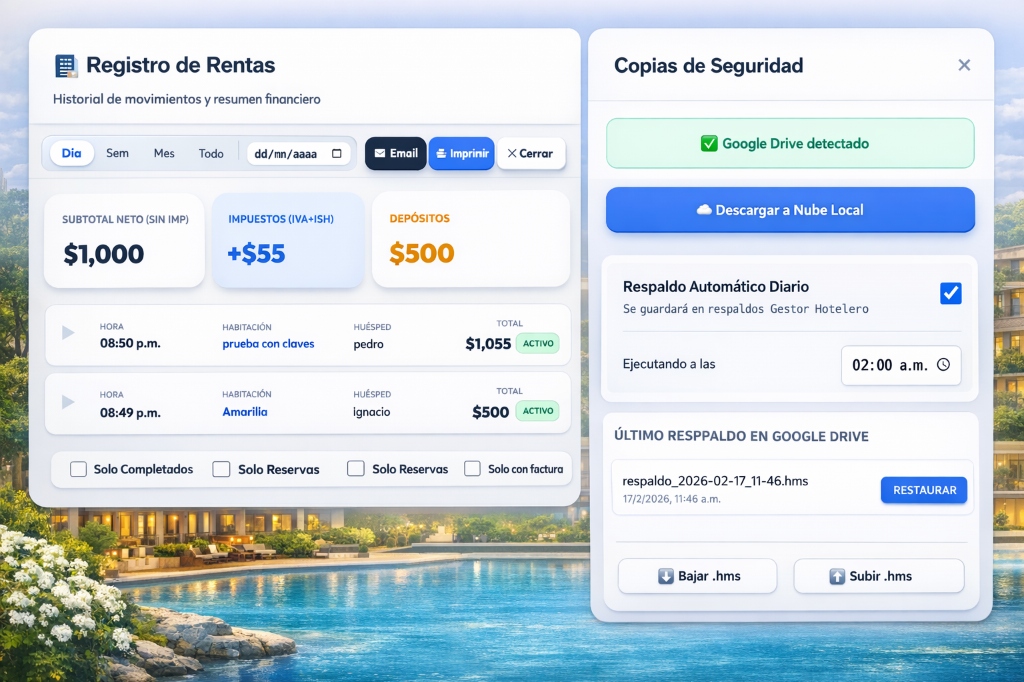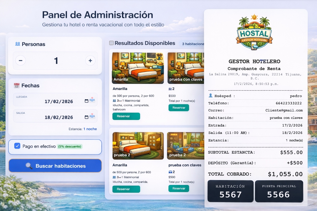 Ideal para hoteles y negocios que manejan reservas directas. Funciona completamente desde tu computadora, sin depender de servidores externos.